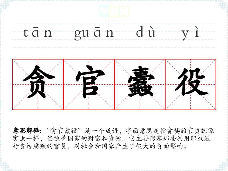 “贪官蠹役”是一个成语,字面意思是指贪婪的官员就像害虫一样,侵蚀着国家的财富和资源。它主要形容那些利用职权进行贪污腐败的官员,对社会和国家产生了极大的负面影响。