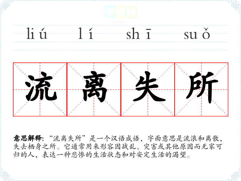 “流离失所”是一个汉语成语,字面意思是流浪和离散,失去栖身之所。它通常用来形容因战乱、灾害或其他原因而无家可归的人,表达一种悲惨的生活状态和对安定生活的渴望。