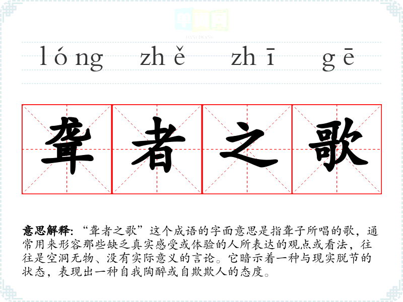 “聋者之歌”这个成语的字面意思是指聋子所唱的歌,通常用来形容那些缺乏真实感受或体验的人所表达的观点或看法,往往是空洞无物、没有实际意义的言论。它暗示着一种与现实脱节的状态,表现出一种自我陶醉或自欺欺人的态度。