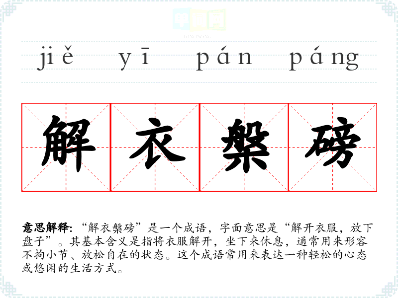 “解衣槃磅”是一个成语,字面意思是“解开衣服,放下盘子”。其基本含义是指将衣服解开,坐下来休息,通常用来形容不拘小节、放松自在的状态。这个成语常用来表达一种轻松的心态或悠闲的生活方式。
