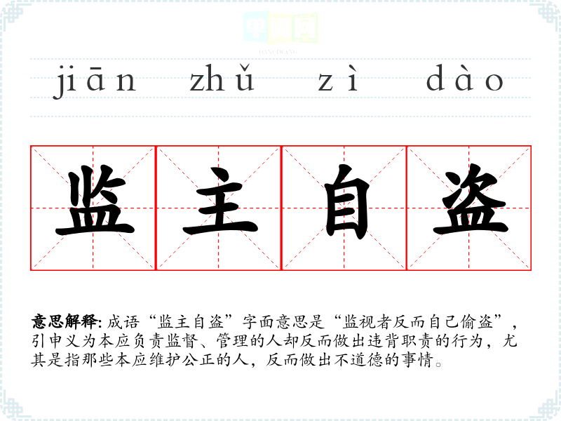 成语“监主自盗”字面意思是“监视者反而自己偷盗”,引申义为本应负责监督、管理的人却反而做出违背职责的行为,尤其是指那些本应维护公正的人,反而做出不道德的事情。