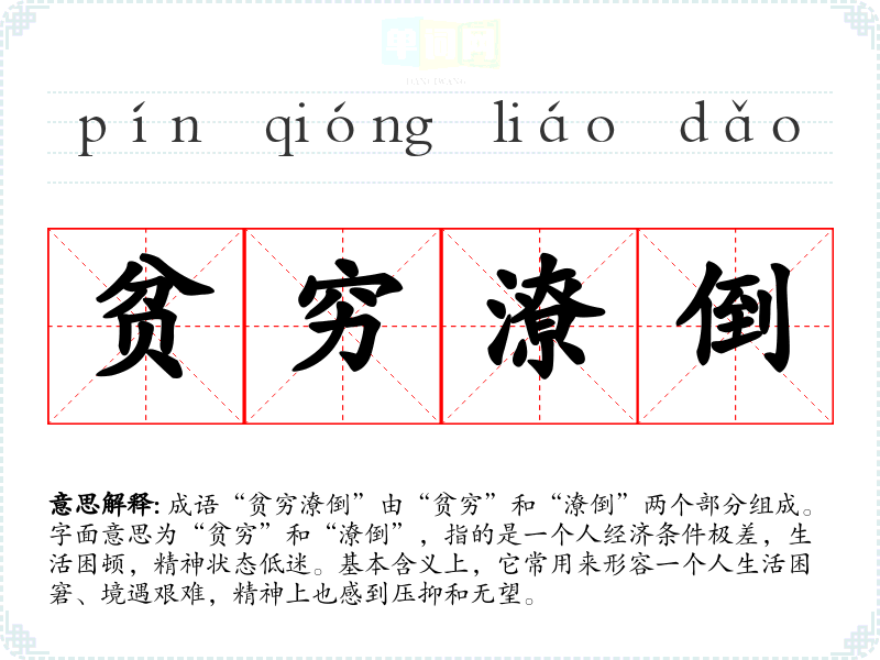 成语“贫穷潦倒”由“贫穷”和“潦倒”两个部分组成。字面意思为“贫穷”和“潦倒”,指的是一个人经济条件极差,生活困顿,精神状态低迷。基本含义上,它常用来形容一个人生活困窘、境遇艰难,精神上也感到压抑和无望。