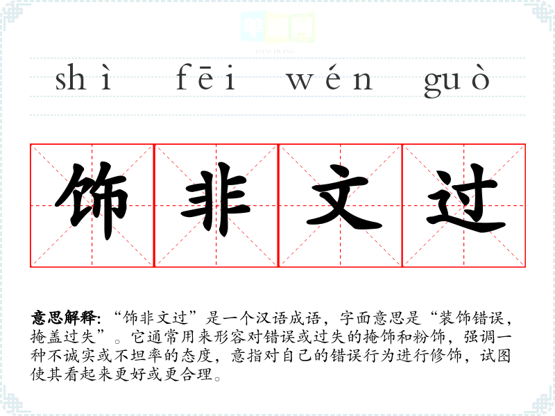 | 饰非文过 | 粉饰掩盖过失、错误。 |