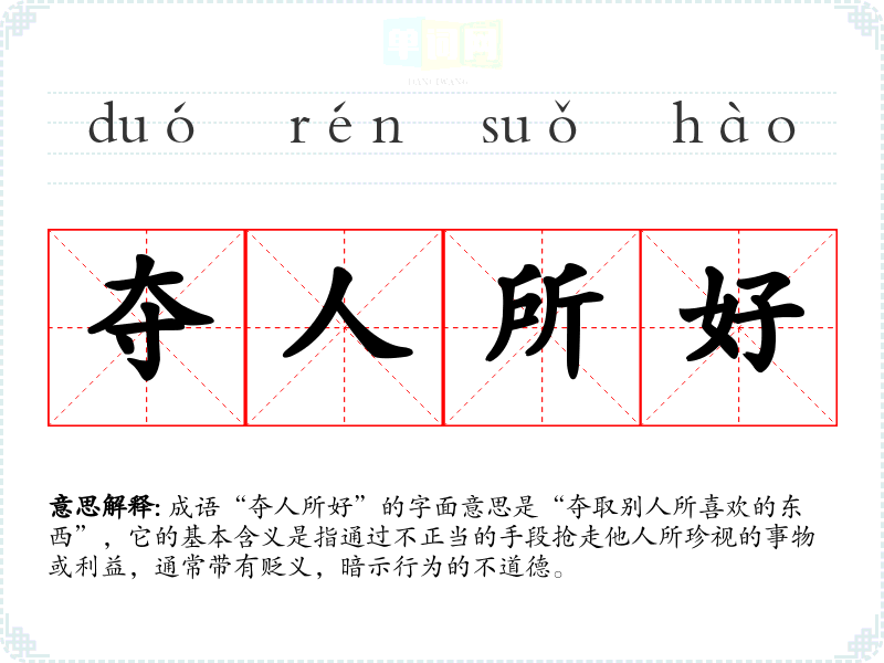 成语“夺人所好”的字面意思是“夺取别人所喜欢的东西”,它的基本含义是指通过不正当的手段抢走他人所珍视的事物或利益,通常带有贬义,暗示行为的不道德。