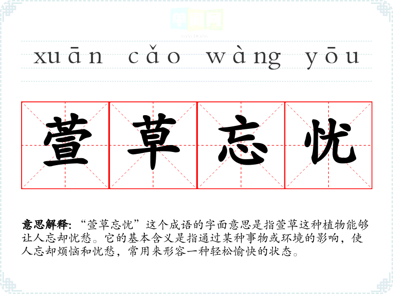 “萱草忘忧”这个成语的字面意思是指萱草这种植物能够让人忘却忧愁。它的基本含义是指通过某种事物或环境的影响,使人忘却烦恼和忧愁,常用来形容一种轻松愉快的状态。