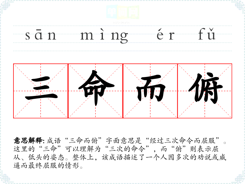 成语“三命而俯”字面意思是“经过三次命令而屈服”。这里的“三命”可以理解为“三次的命令”,而“俯”则表示屈从、低头的姿态。整体上,该成语描述了一个人因多次的劝说或威逼而最终屈服的情形。