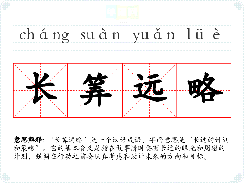 “长筭远略”是一个汉语成语,字面意思是“长远的计划和策略”。它的基本含义是指在做事情时要有长远的眼光和周密的计划,强调在行动之前要认真考虑和设计未来的方向和目标。