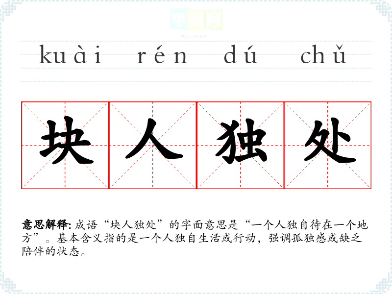 成语“块人独处”的字面意思是“一个人独自待在一个地方”。基本含义指的是一个人独自生活或行动,强调孤独感或缺乏陪伴的状态。