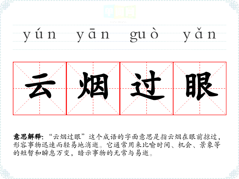 “云烟过眼”这个成语的字面意思是指云烟在眼前掠过,形容事物迅速而轻易地消逝。它通常用来比喻时间、机会、景象等的短暂和瞬息万变,暗示事物的无常与易逝。