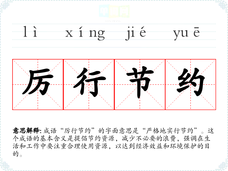 成语“厉行节约”的字面意思是“严格地实行节约”。这个成语的基本含义是提倡节约资源,减少不必要的浪费,强调在生活和工作中要注重合理使用资源,以达到经济效益和环境保护的目的。