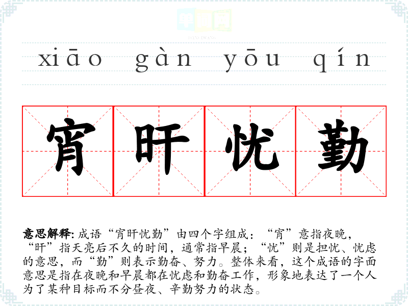 成语“宵旰忧勤”由四个字组成:“宵”意指夜晚,“旰”指天亮后不久的时间,通常指早晨;“忧”则是担忧、忧虑的意思,而“勤”则表示勤奋、努力。整体来看,这个成语的字面意思是指在夜晚和早晨都在忧虑和勤奋工作,形象地表达了一个人为了某种目标而不分昼夜、辛勤努力的状态。