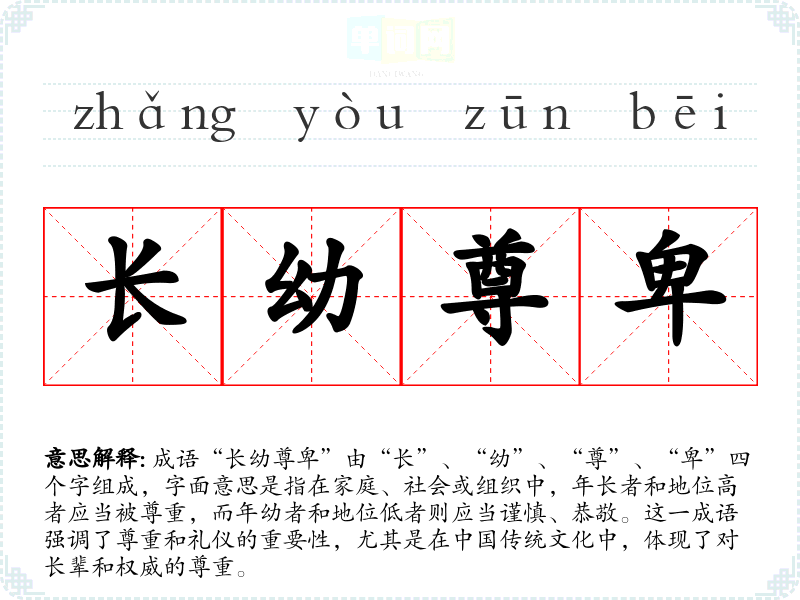 成语“长幼尊卑”由“长”、“幼”、“尊”、“卑”四个字组成,字面意思是指在家庭、社会或组织中,年和地位高者应当被尊重,而年幼者和地位低者则应当谨慎、恭敬。这一成语强调了尊重和礼仪的重要性,尤其是在传统文化中,体现了对长辈和权威的尊重。