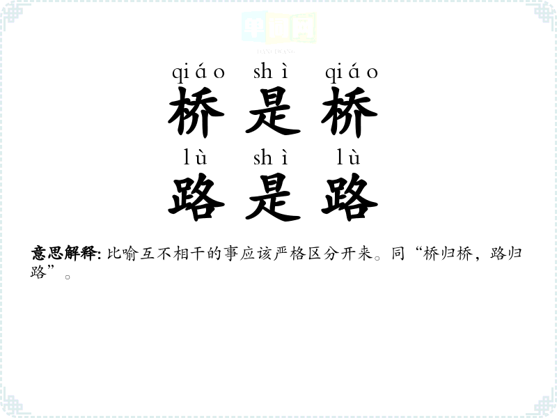 | 桥是桥,路是路 | 比喻互不相干的事应该严格区分开来。同“桥归桥,路归路”。 |