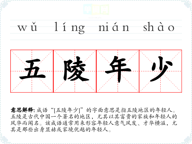 “[五陵年少]”出自唐代诗人王翰的《凉州词》。诗中提到五陵的年轻人,描绘了他们的生活状态和气质。王翰通过这一成语表达了对年轻人的赞美,同时也蕴含着对人生短暂、青春易逝的感慨。