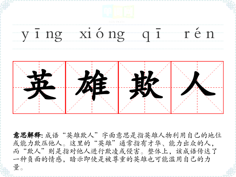 成语“英雄欺人”字面意思是指英雄人物利用自己的地位或能力欺压他人。这里的“英雄”通常指有才华、能力出众的人,而“欺人”则是指对他人进行欺凌或侵害。整体上,该成语传达了一种负面的情感,暗示即使是被尊重的英雄也可能滥用自己的力量。