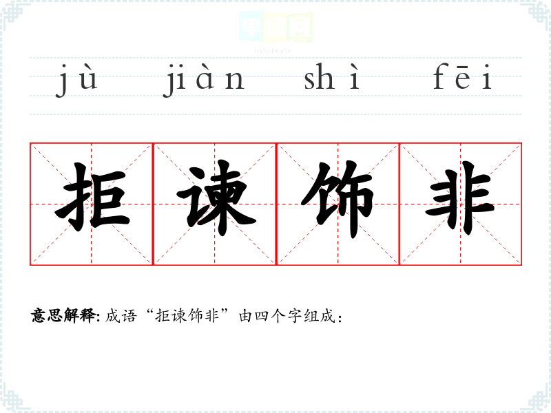 | 拒谏饰非 | 谏:直言规劝;饰:掩饰;非:错误。拒绝劝告,掩饰错误。 |
