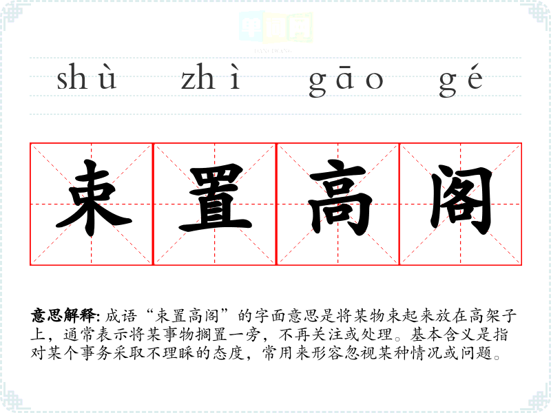 成语“束置高阁”的字面意思是将某物束起来放在高架子上,通常表示将某事物搁置一旁,不再关注或处理。基本含义是指对某个事务采取不理睬的态度,常用来形容忽视某种情况或问题。