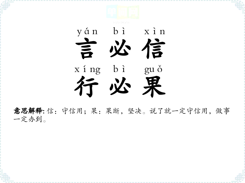 | 一言立信 | 信:信誉。以一句话树立了信誉。 |
