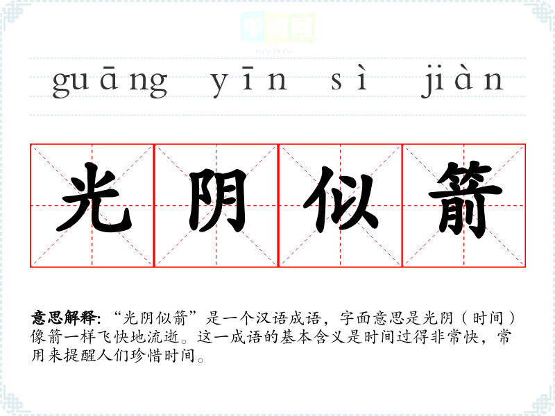 “光阴似箭”是一个汉语成语,字面意思是光阴(时间)像箭一样飞快地流逝。这一成语的基本含义是时间过得非常快,常用来提醒人们珍惜时间。