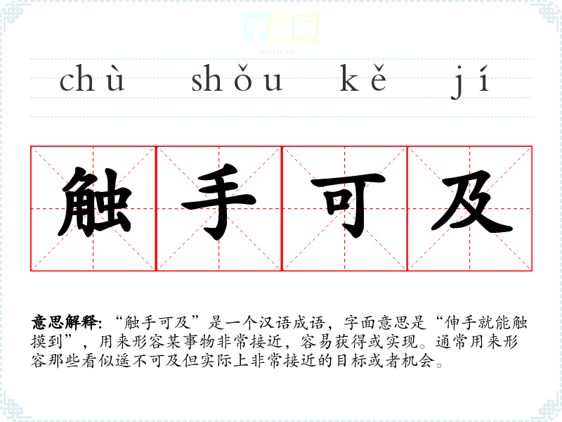 “触手可及”是一个汉语成语,字面意思是“伸手就能触摸到”,用来形容某事物非常接近,容易获得或实现。通常用来形容那些看似遥不可及但实际上非常接近的目标或者机会。