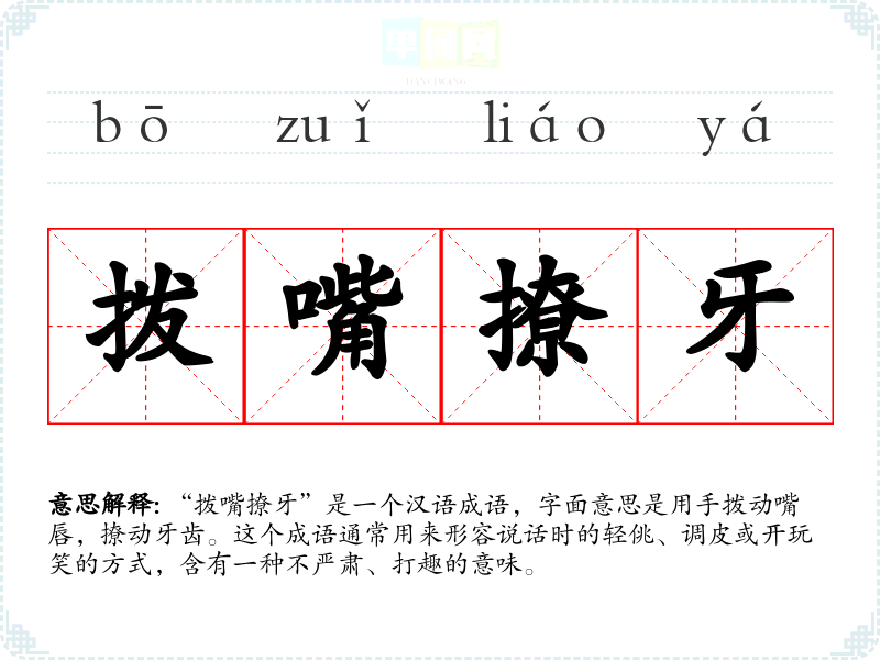 “拨嘴撩牙”是一个汉语成语,字面意思是用手拨动嘴唇,撩动牙齿。这个成语通常用来形容说话时的轻佻、调皮或开玩笑的方式,含有一种不严肃、打趣的意味。