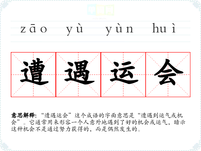 “遭遇运会”这个成语的字面意思是“遭遇到运气或机会”。它通常用来形容一个人意外地遇到了好的机会或运气,暗示这种机会不是通过努力获得的,而是偶然发生的。