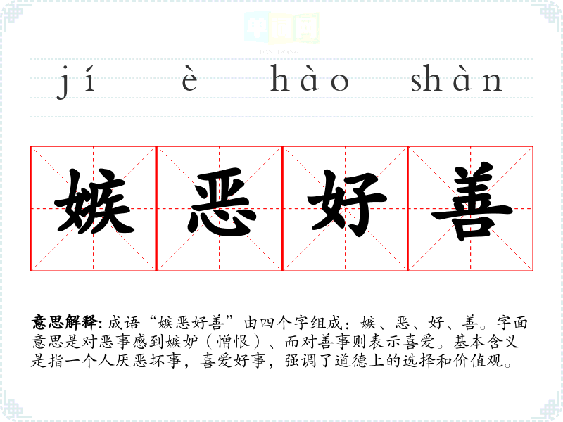 成语“嫉恶好善”由四个字组成:嫉、恶、好、善。字面意思是对恶事感到嫉妒(憎恨)、而对善事则表示喜爱。基本含义是指一个人厌恶坏事,喜爱好事,强调了道德上的选择和价值观。