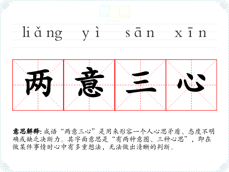 成语“两意三心”是用来形容一个人心思矛盾、态度不明确或缺乏决断力。其字面意思是“有两种意图、三种心思”,即在做某件事情时心中有多重想法,无法做出清晰的判断。