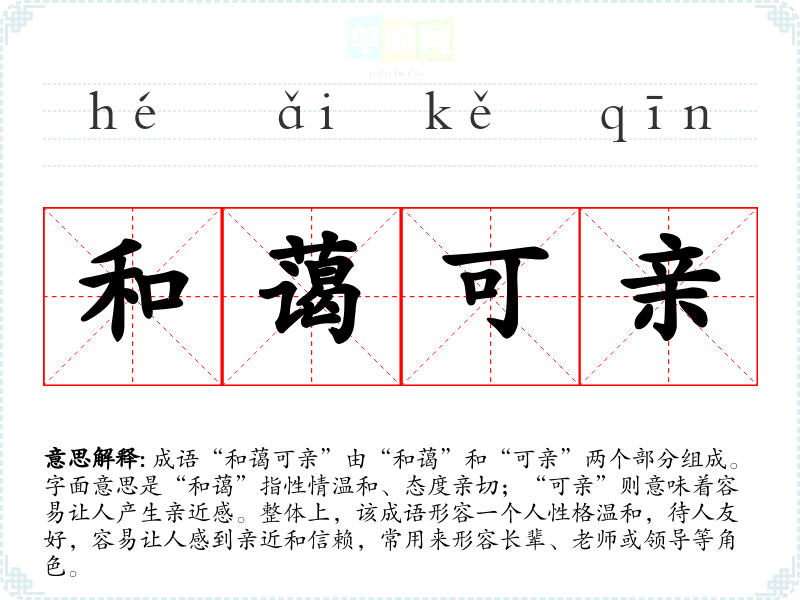 成语“和蔼可亲”由“和蔼”和“可亲”两个部分组成。字面意思是“和蔼”指性情温和、态度亲切;“可亲”则意味着容易让人产生亲近感。整体上,该成语形容一个人性格温和,待人友好,容易让人感到亲近和信赖,常用来形容长辈、老师或领导等角色。