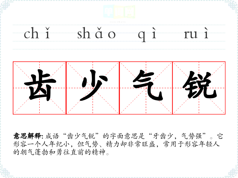 成语“齿少气锐”的字面意思是“牙齿少,气势强”。它形容一个人年纪小,但气势、精力却非常旺盛,常用于形容年轻人的朝气蓬勃和勇往直前的精神。