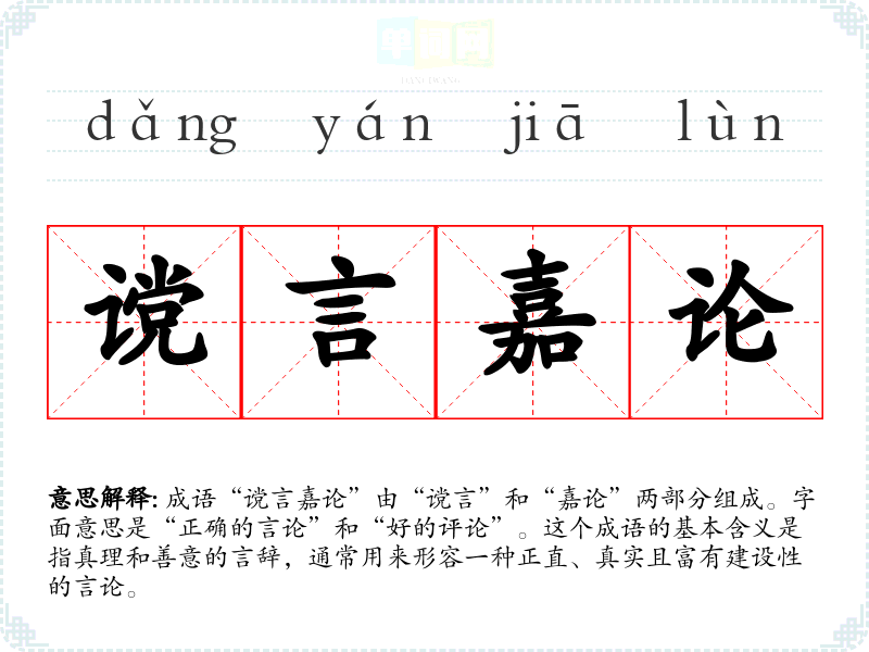 成语“谠言嘉论”由“谠言”和“嘉论”两部分组成。字面意思是“正确的言论”和“好的评论”。这个成语的基本含义是指真理和善意的言辞,通常用来形容一种正直、真实且富有建设性的言论。