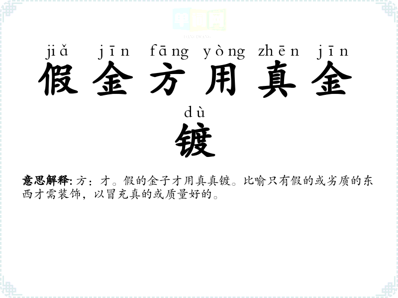 | 假金方用真金镀 | 方:才。假的金子才用真真镀。比喻只有假的或劣质的东西才需装饰,以冒充真的或质量好的。 |