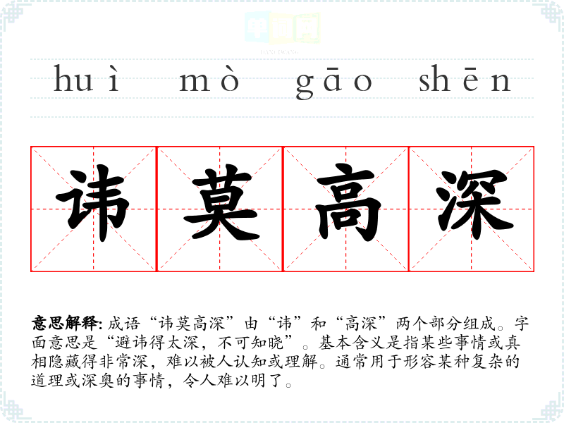成语“讳莫高深”由“讳”和“高深”两个部分组成。字面意思是“避讳得太深,不可知晓”。基本含义是指某些事情或真相隐藏得非常深,难以被人认知或理解。通常用于形容某种复杂的道理或深奥的事情,令人难以明了。