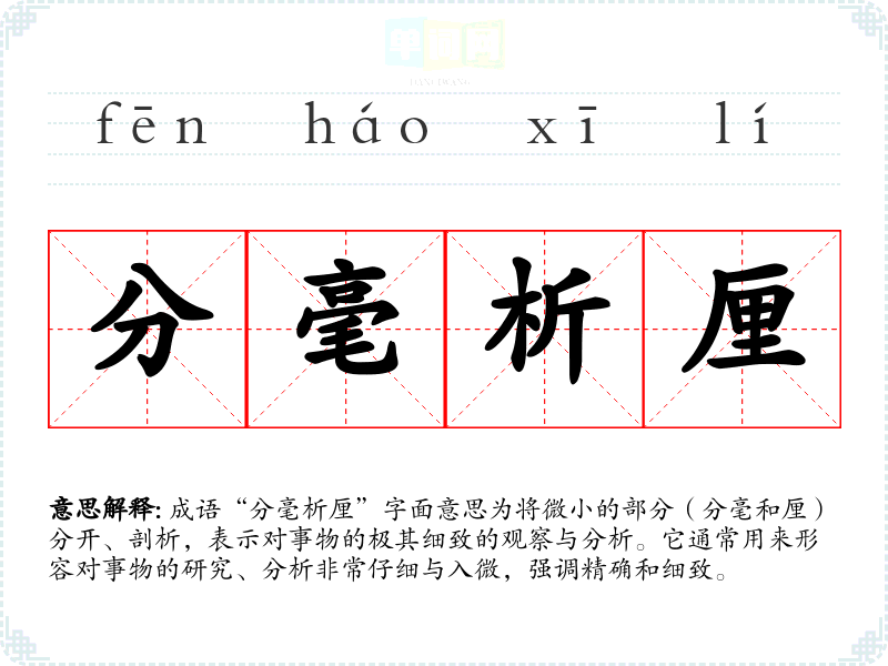 成语“分毫析厘”字面意思为将微小的部分(分毫和厘)分开、剖析,表示对事物的极其细致的观察与分析。它通常用来形容对事物的研究、分析非常仔细与入微,强调精确和细致。