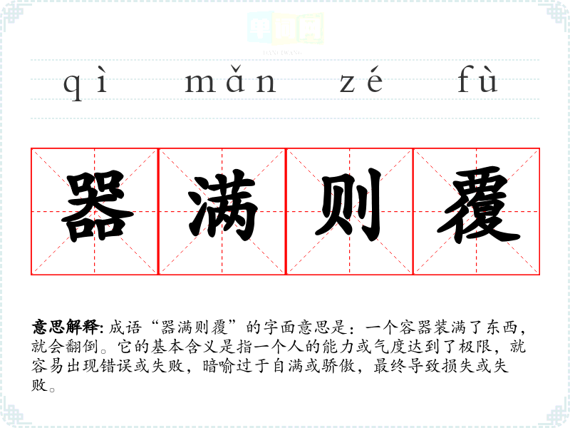 成语“器满则覆”的字面意思是:一个容器装满了东西,就会翻倒。它的基本含义是指一个人的能力或气度达到了极限,就容易出现错误或失败,暗喻过于自满或骄傲,最终导致损失或失败。