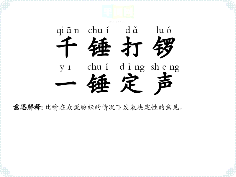 | 千锤打锣,一锤定音 | 比喻在众说纷纭的情况下发表决定性的意见。 |
