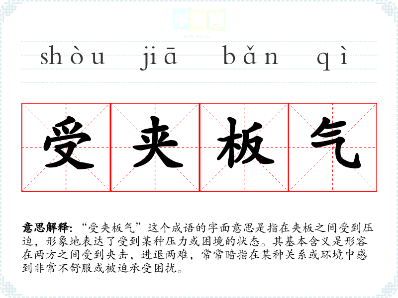 “受夹板气”并没有明确的历史典故,但夹板的意象在古代常用于形容一种被夹迫的状态。在古代的生活中,夹板常用于木工等职业,夹板之间的压力让人感到窒息,因此这一成语隐喻着一种被动的、无法逃脱的困境。