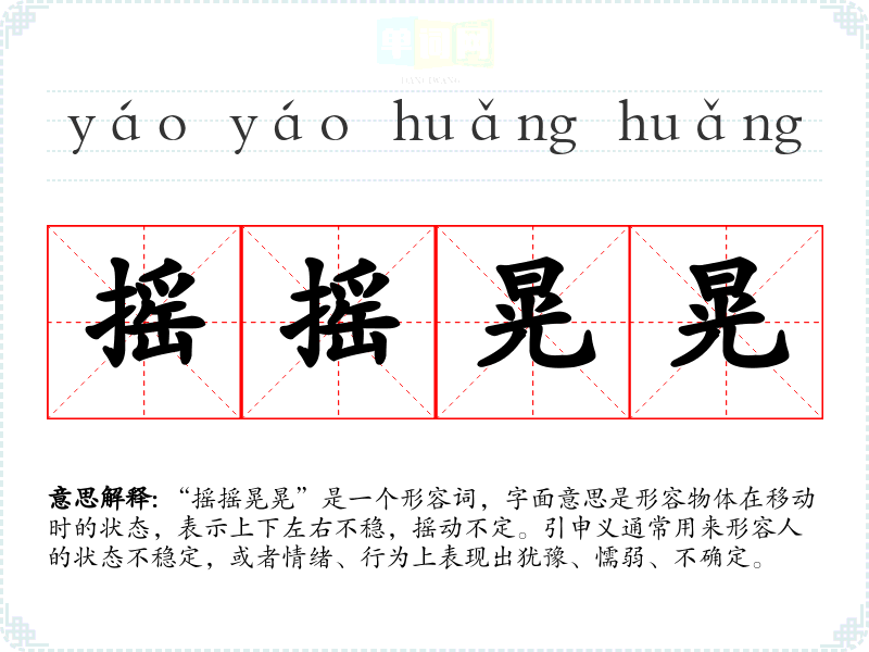 “摇摇晃晃”是一个形容词,字面意思是形容物体在移动时的状态,表示上下左右不稳,摇动不定。引申义通常用来形容人的状态不稳定,或者情绪、行为上表现出犹豫、懦弱、不确定。
