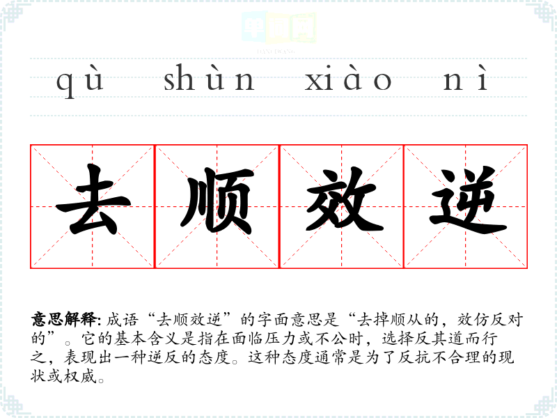 成语“去顺效逆”的字面意思是“去掉顺从的,效仿反对的”。它的基本含义是指在面临压力或不公时,选择反其道而行之,表现出一种逆反的态度。这种态度通常是为了反抗不合理的现状或权威。