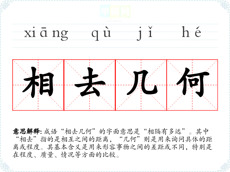 成语“相去几何”的字面意思是“相隔有多远”。其中“相去”指的是相互之间的距离,“几何”则是用来询问具体的距离或程度。其基本含义是用来形容事物之间的差距或不同,特别是在程度、质量、情况等方面的比较。