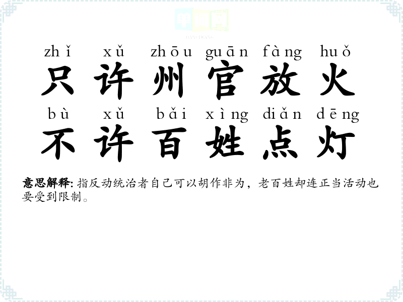 | 只准州官放火,不许百姓点灯 | 指统治者自己可以胡作非为,老百姓却连正当活动也要受到限制。 |