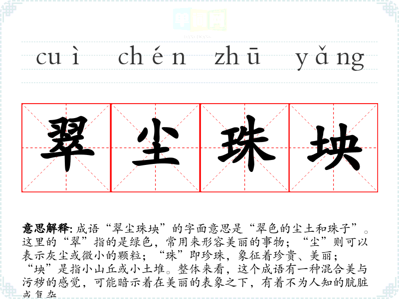 “翠尘珠坱”并不是一个广为人知的成语,可能是某种特定文献、诗词或地方方言中的表达。在古代文学中,常常使用“翠”和“珠”来表现美丽,而“尘”往往与世俗、卑微相联系。因此,该成语可能反映了古人对美与丑、纯洁与污秽的思考。