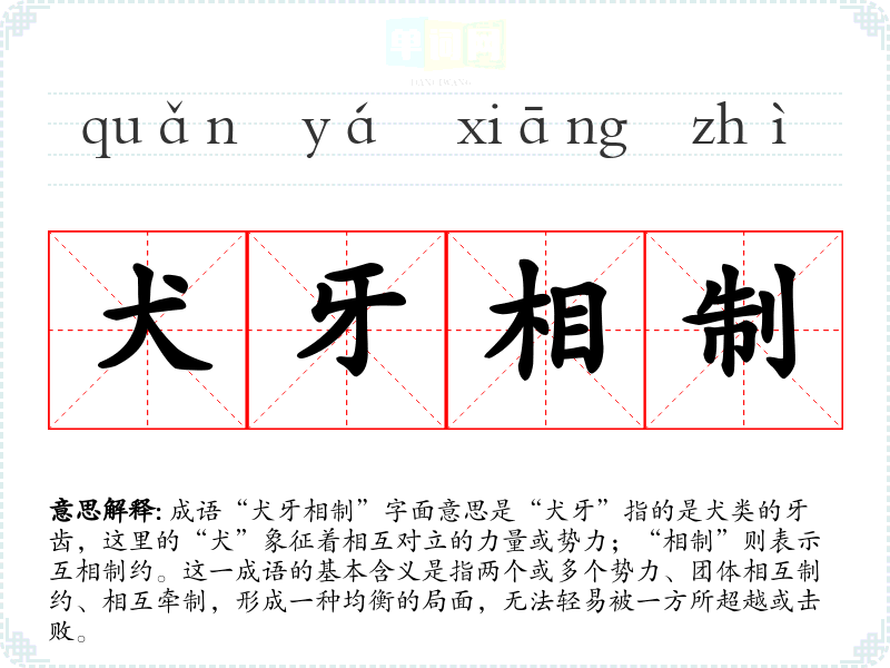 成语“犬牙相制”字面意思是“犬牙”指的是犬类的牙齿,这里的“犬”象征着相互对立的力量或势力;“相制”则表示互相制约。这一成语的基本含义是指两个或多个势力、团体相互制约、相互牵制,形成一种均衡的局面,无法轻易被一方所超越或击败。