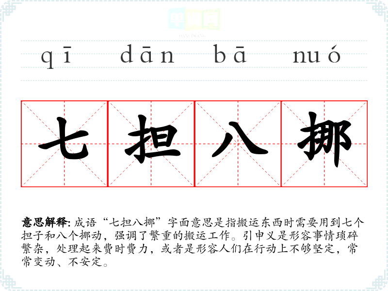 成语“七担八挪”字面意思是指搬运东西时需要用到七个担子和八个挪动,强调了繁重的搬运工作。引申义是形容事情琐碎繁杂,处理起来费时费力,或者是形容人们在行动上不够坚定,常常变动、不安定。