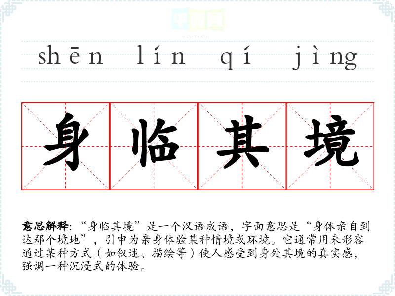 “身临其境”是一个汉语成语,字面意思是“身体亲自到达那个境地”,引申为亲身体验某种情境或环境。它通常用来形容通过某种方式(如叙述、描绘等)使人感受到身处其境的真实感,强调一种沉浸式的体验。