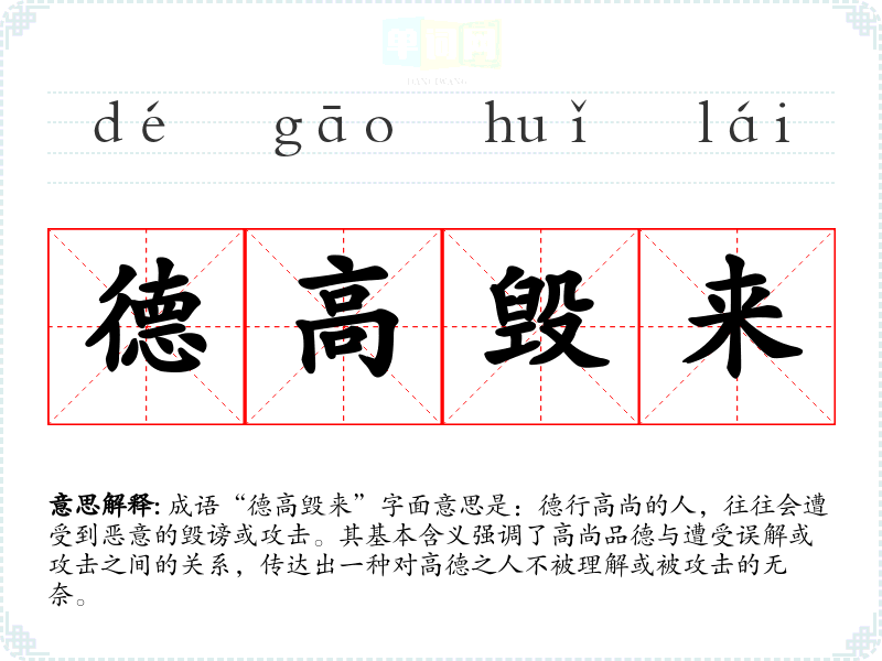 成语“德高毁来”字面意思是:德行高尚的人,往往会遭受到恶意的毁谤或攻击。其基本含义强调了高尚品德与遭受误解或攻击之间的关系,传达出一种对高德之人不被理解或被攻击的无奈。