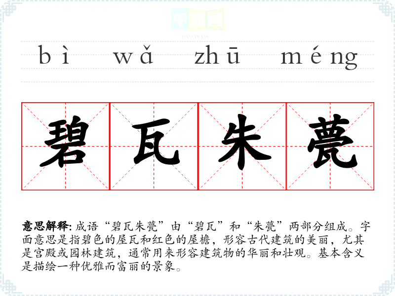 | 碧瓦朱檐 | 碧瓦:青绿色的瓦;檐:屋檐。青色的瓦,红色的檐。形容建筑的华美。 |