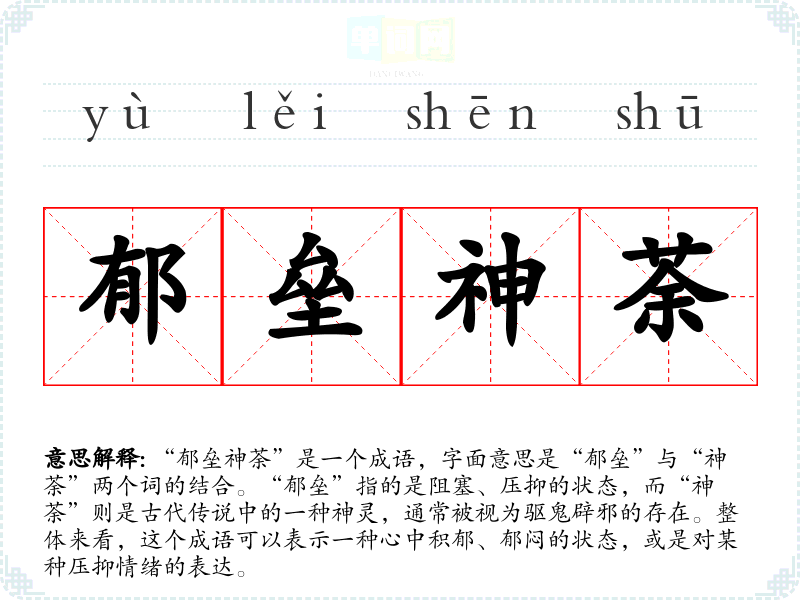 “郁垒神荼”并没有明确的历史典故来源。它可能源于古代神话传说中的神荼,结合“郁垒”一词,反映了古人对于心理状态和神灵信仰的探索。神荼的形象常常与对抗邪灵、驱除恶运有关,因此这个成语可以暗示在面对内心的压抑和外界的困扰时,寻求某种力量来排解困惑。