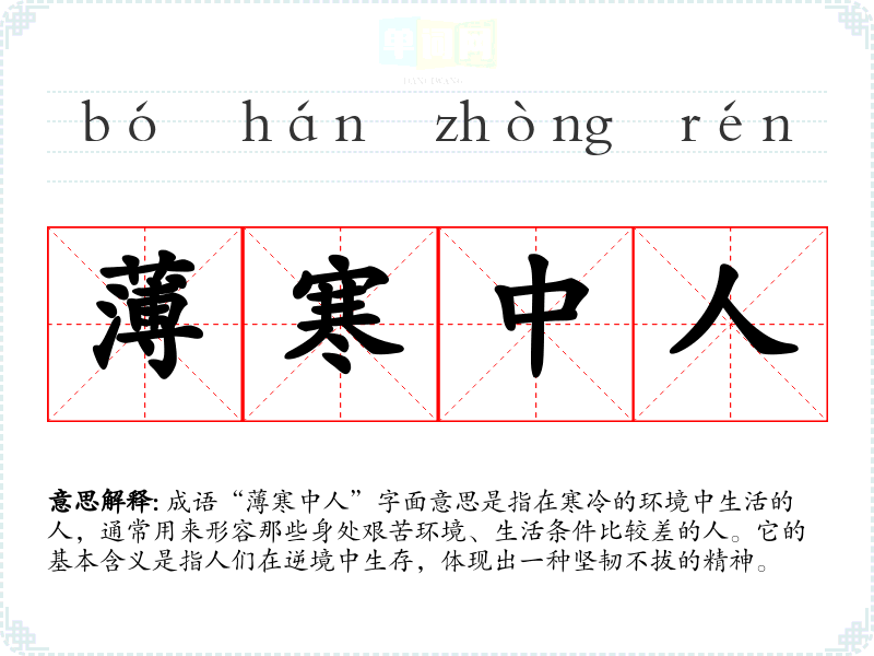 成语“*寒中人”字面意思是指在寒冷的环境中生活的人,通常用来形容那些身处艰苦环境、生活条件比较差的人。它的基本含义是指人们在逆境中生存,体现出一种坚韧不拔的精神。