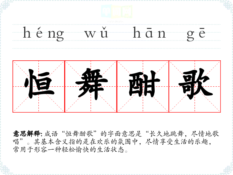 成语“恒舞酣歌”的字面意思是“长久地跳舞,尽情地歌唱”。其基本含义指的是在欢乐的氛围中,尽情享受生活的乐趣,常用于形容一种轻松愉快的生活状态。